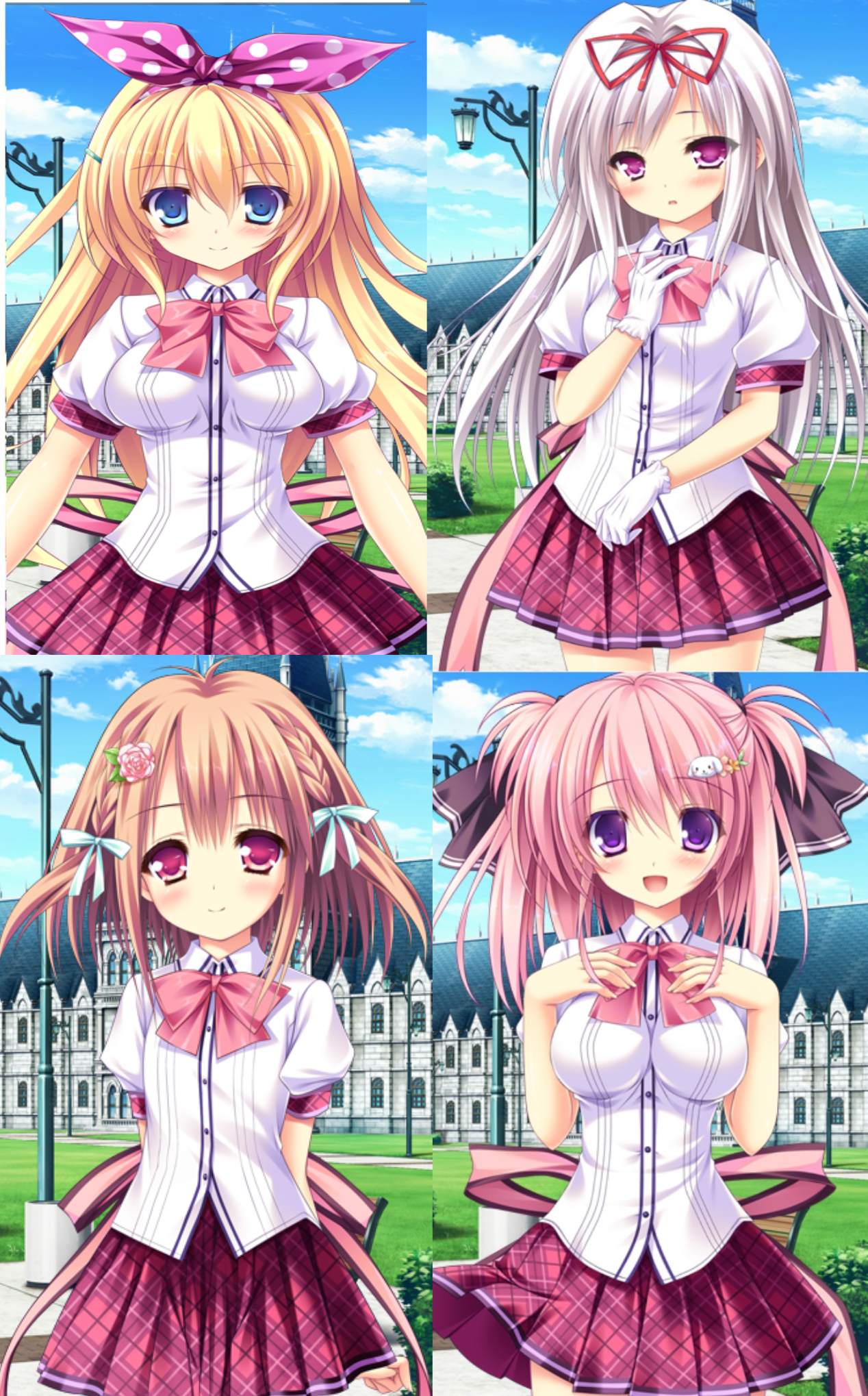 次に制服を見ていく。構成は上からジャケット、ブラウス、コルセット型のスカート、腰と胸元にリボンという形。上着は白のブレザーの前をボタンで止めないタイプ。襟は下にさがっており肩にかかる感じ、白を基調に赤と青の差し色が入っている。ブラウスは各イベントCGを見たらわかるが縦線入りの薄いピンクで襟はフリルになっており首にリボンを巻く形。スカートはコルセット型のパーツとスカートが一体化した形で裾に白フリルが着いている。足元は愛良がタイツ、美紀は黒ニーソ、小々路と遥が白のロングソックス(小々路のソックスはフリル付き)それぞれリボン付きの革靴を履いている。胸のリボンは青、腰のリボンは青白青の色に別れている。学院では通学帽子が正式に採用されているが愛良は帽子を被り登校して模様が描かれている。遥は研究職に就いてることもあり制服の上に白衣を羽織って登場することもしばしば。全体的に青と白の色で可愛くかつ爽やかに装飾されている。Lumpの制服ではありがちな制服デザイン、タユタマの創成学園や花色ヘプタグラムの七華学園、恋相リレーションの天海学院に通ずるものがある。